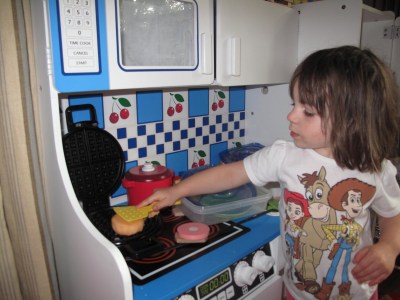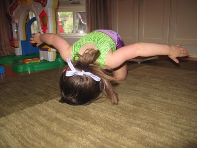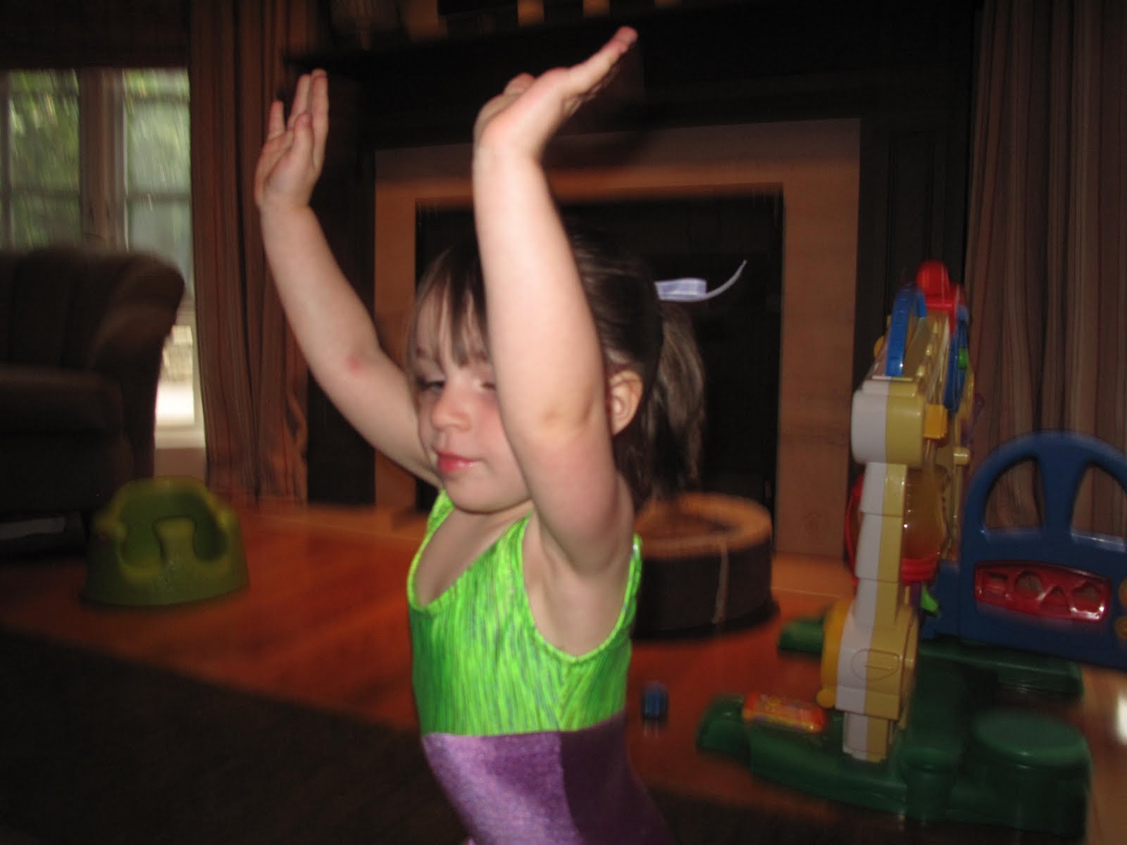 This is what Sam hopes. We are very excited about our kids being involved in some sort of team sport (not in an insane way–traveling teams and whatever at 4) but in a “learning to work with others in a competitive endeavor” sort of way. West Point? Berks Gymnastics? Hello! Lily looks like she is on her way-she’s got the moves and look down already! She told us she was Chelsea somebody from a competition she watched with her Dada. She even let me brush, pull back, spray her hair and tie a ribbon in it.