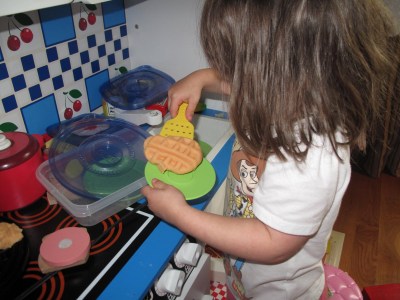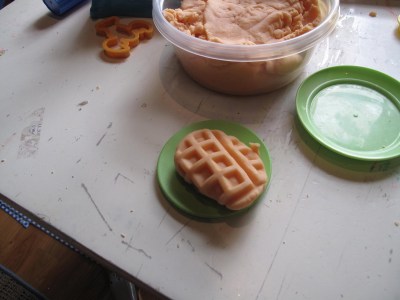 So we created an orangey-yellow raspberry-scented batch. Lily even got involved in the kneading. And then we used our cool doh tools in the playroom…but THIS morning, she was a little bit more creative…