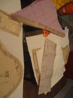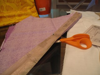 Instead of my casual design of little girl clothes and use of online tutorials to make my own clothes-both of which I have been using exclusively as I learn to sew, I am attempting to use a PATTERN! This both very exciting and a whole lot of intimidating to me. I know I will make a few mistakes. It has taken me some nerve to get to the point, right now, where I am going to actually cut through the pattern and the fabric. Taking a deep breath. I guess I can update at each step but here is what it looks like so far on the dining room table-aka-my sewing workspace 🙂