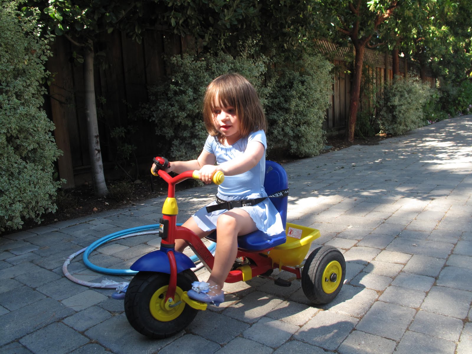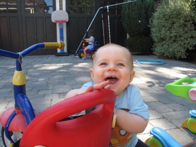 Oliver continues to be a sturdy and steady little pre-walker. I know, I know, I reported earlier that he was “walking” but he was really is (and continues) just taking steps. But individual steps lead to combined steps and that means walking! But he really wants to keep up with whatever his big sister is doing so while Lily rides her trike outside (one day she just got the hang of it with Sam’s help! Yay Lily!) this is what Ollie does: