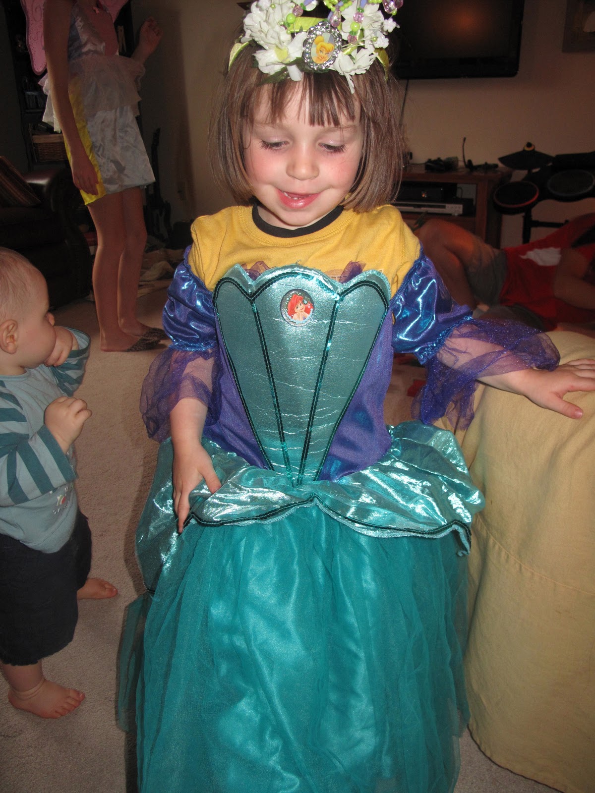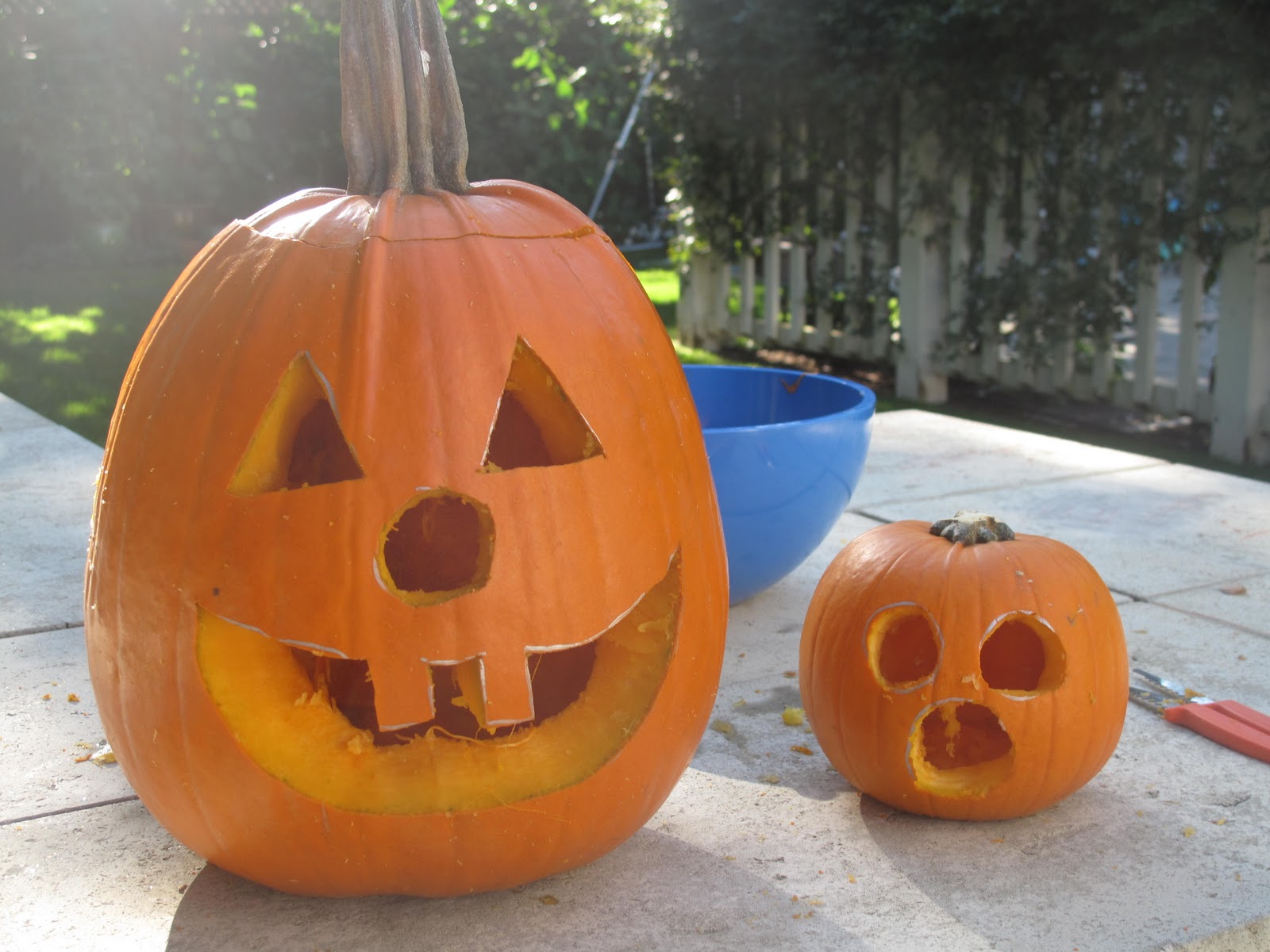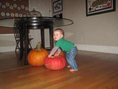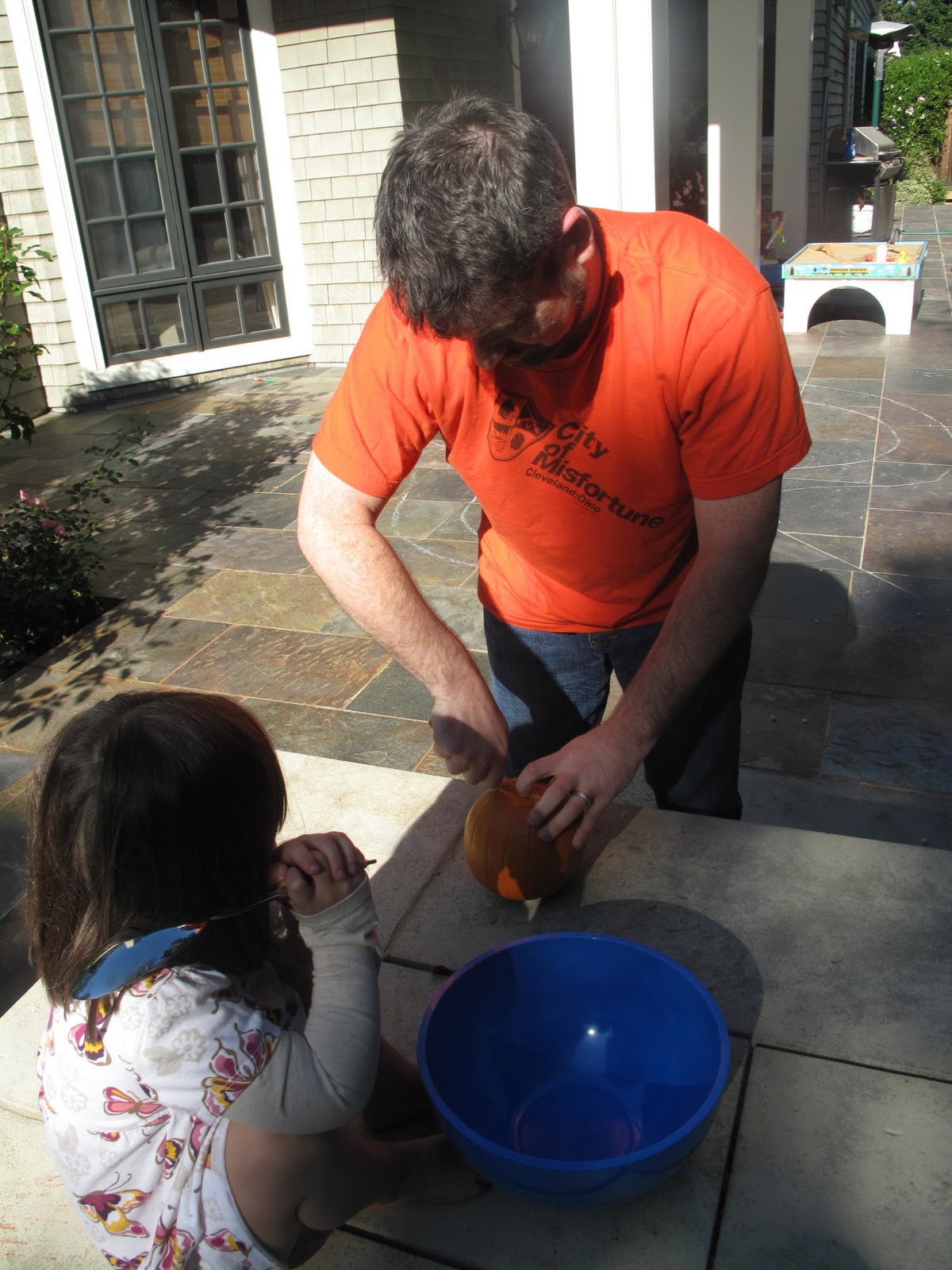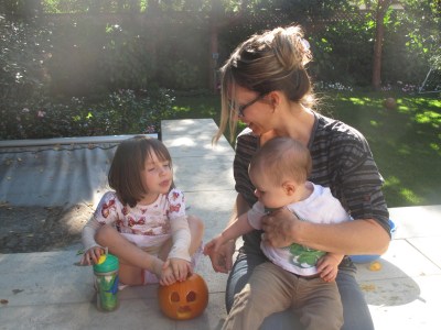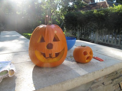 Sunday we readied the costumes and carved our pumpkins. Strangely enough, even though Lily loves to paint and get messy that way, she wanted nothing to do with the pumpkin guts. Notice the toothy grin of the big pumpkin. Looks like a Weller, don’t you think?!?