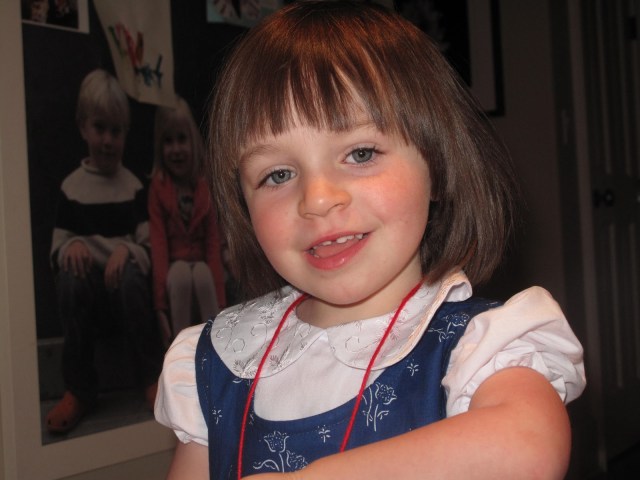From these photos you would never guess that yesterday we were at the doctor’s being diagnosed with ear infections. Thankfully I took Ollie along to Lily’s appointment. Her preschool called about an hour after she arrived;she was complaining that her ear hurt. Both kids battled colds and ran fevers early in the weekend but I just thought it was running its course. When the doc took a look at Lily’s ears and then noticed Ollie’s reddish, goopy eyes, he prescribed some antibiotics for both little people. Neither really showed they were in any pain….they were just awfully lethargic and a little cranky. Today, though, they are definitely on the mend! And it was Picture Day at school. Lily wore an outfit sent to her from Aunt Susie in Italy. When else can you wear a peter pan collar with a cute apron overlay? We took advantage!
