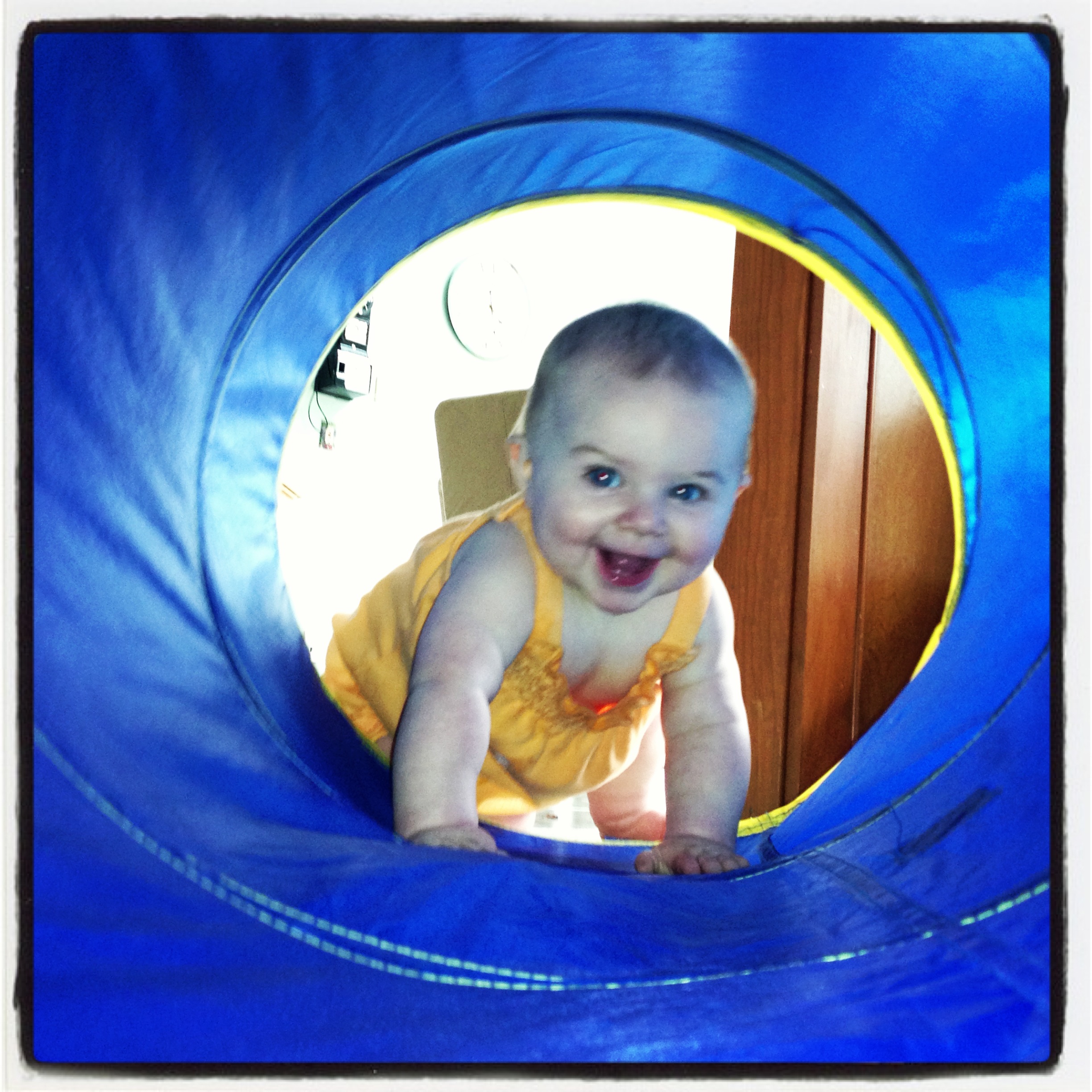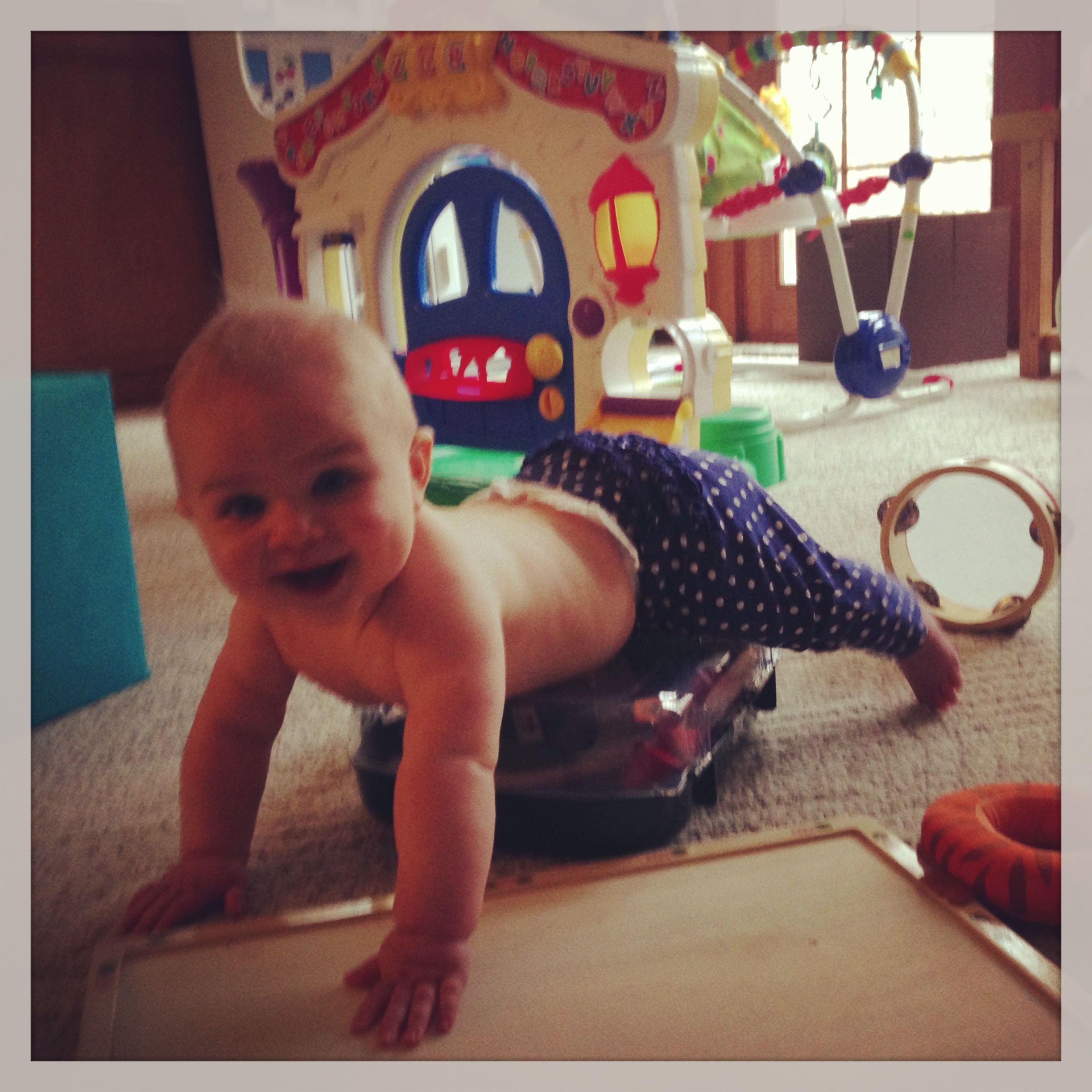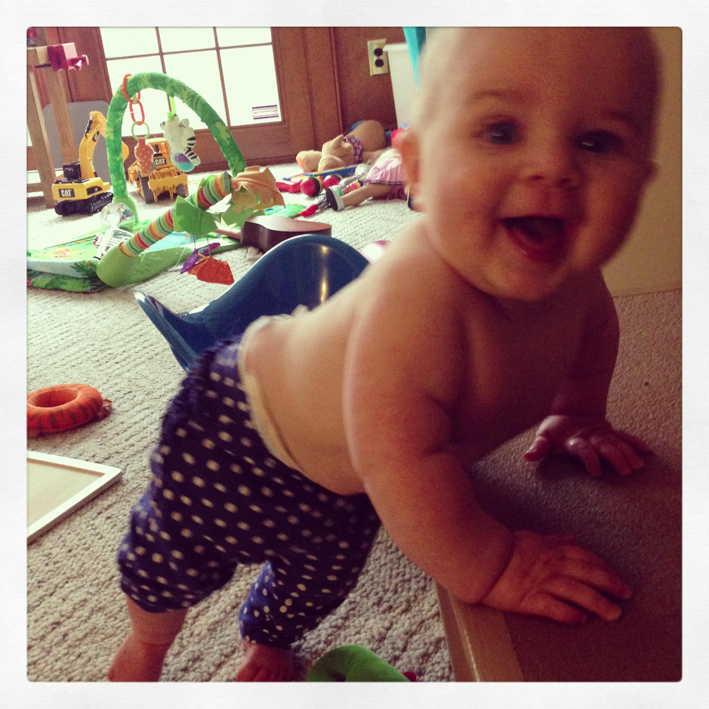 She is one speedy crawler, skootcher, and stander. I look down when I am cooking dinner-and there she is!