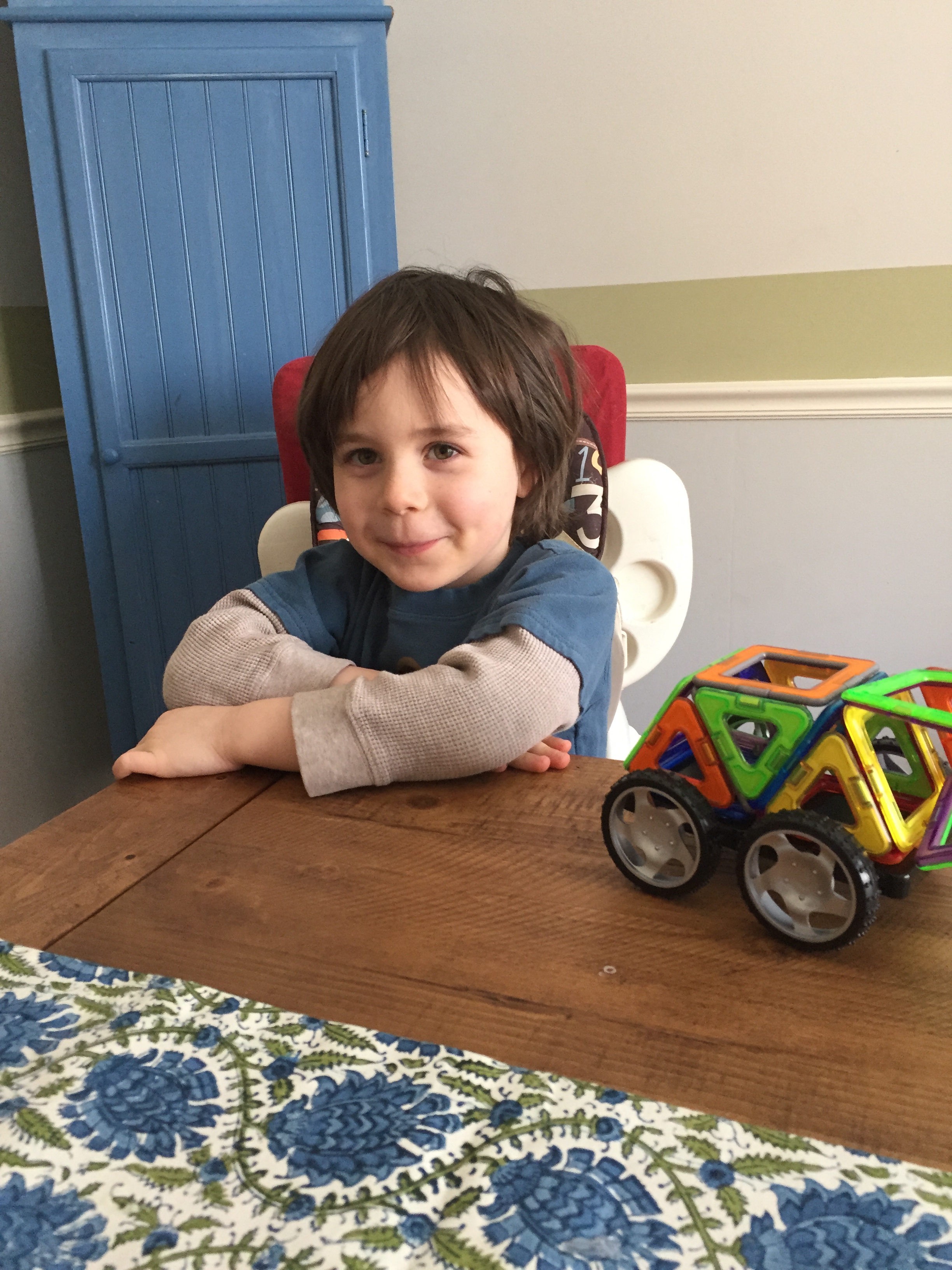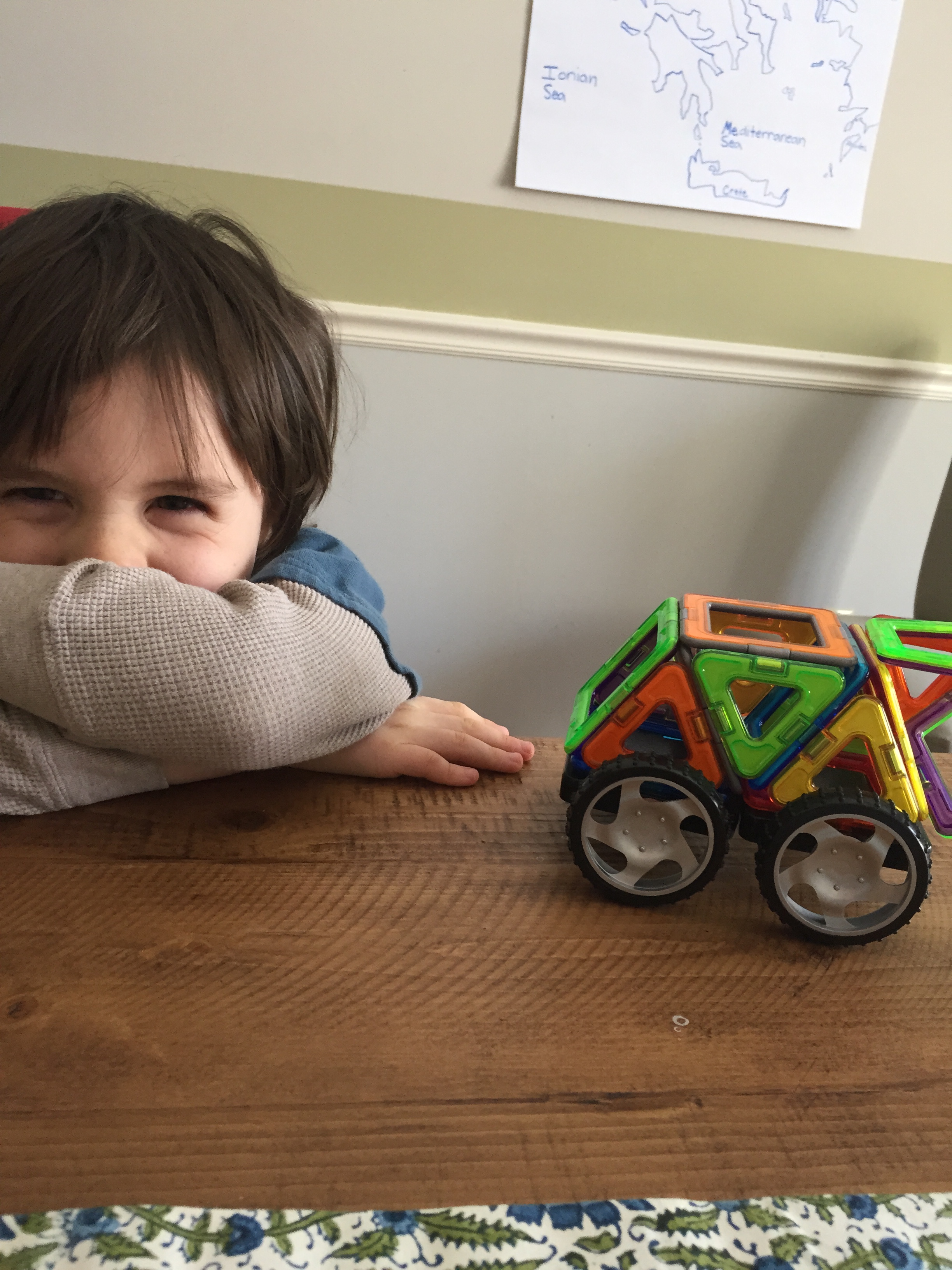 A highlight of my day was when our read aloud turned into a maker’s fury of creative learning. After Ollie got home from school and Em was napping, we started a child’s version on The Odyssey .  We learned about Helen of Troy, the Trojan horse and the lotus-eaters.  By this time, L had had enough and asked if we could read another book we reference called Story of the World ; last time we read about the Minotaur on the island of Crete and today we learned about great warriors, the Mycenaeans. Since we didn’t know what invention allowed the Mycenaeans to overtake their enemies I explained what a chariot is and we built one with our mag-formers, an elephant, and some binocular strings. O got the idea straight and made a much better, more elaborate, quad-chariot.