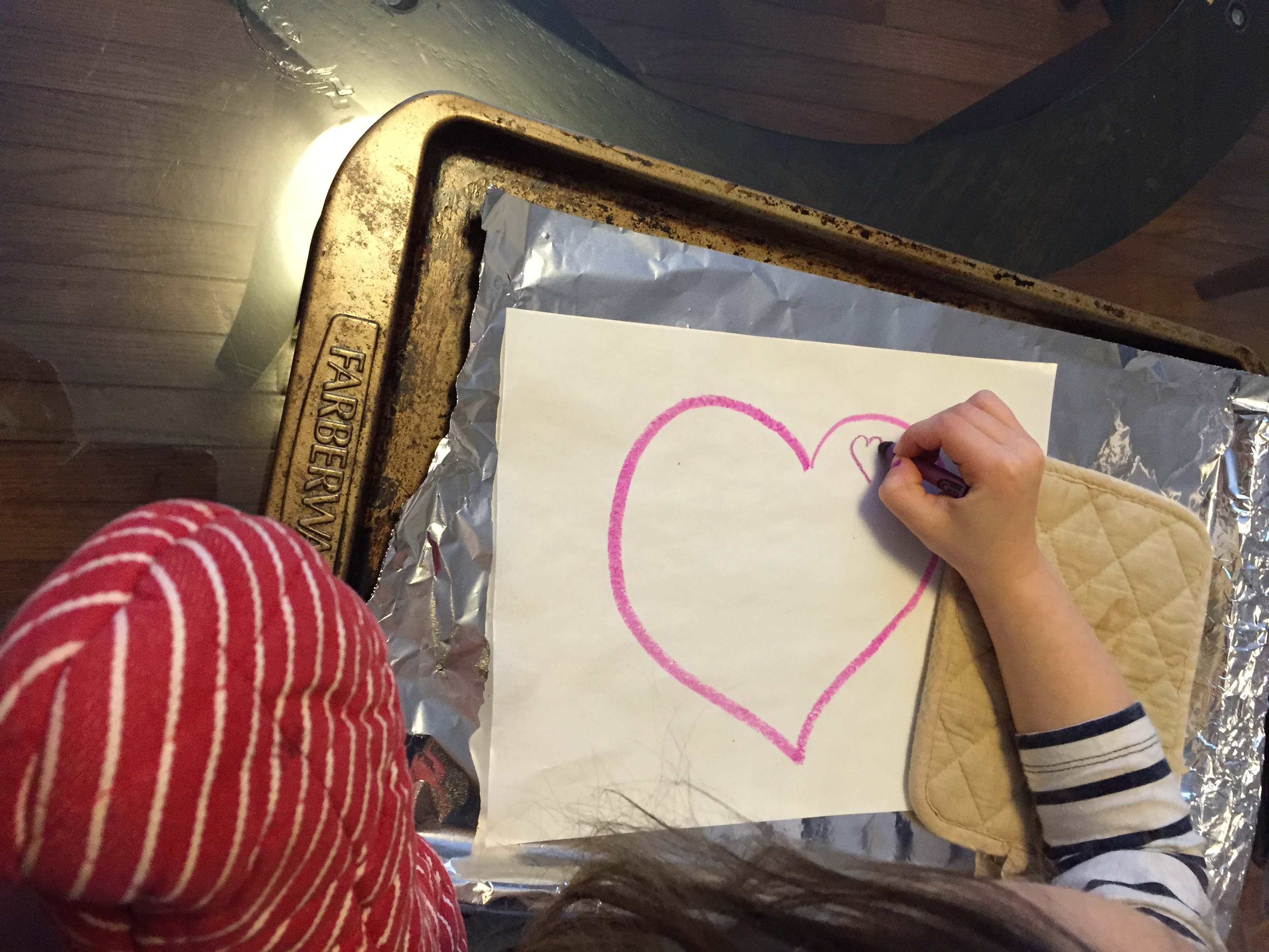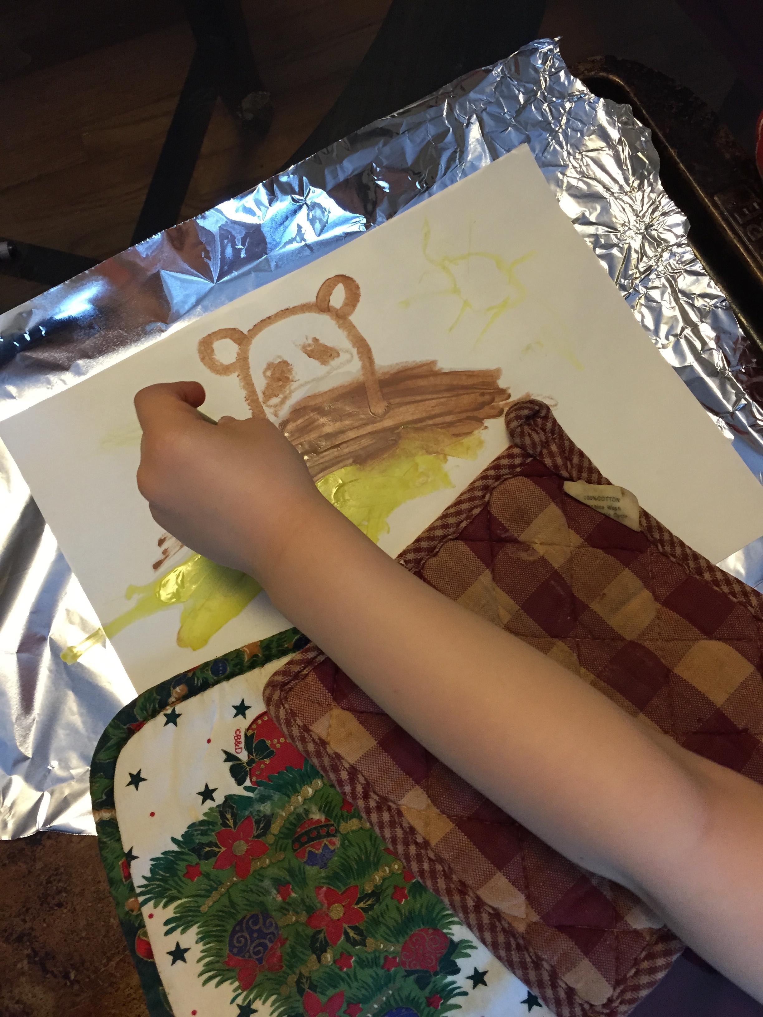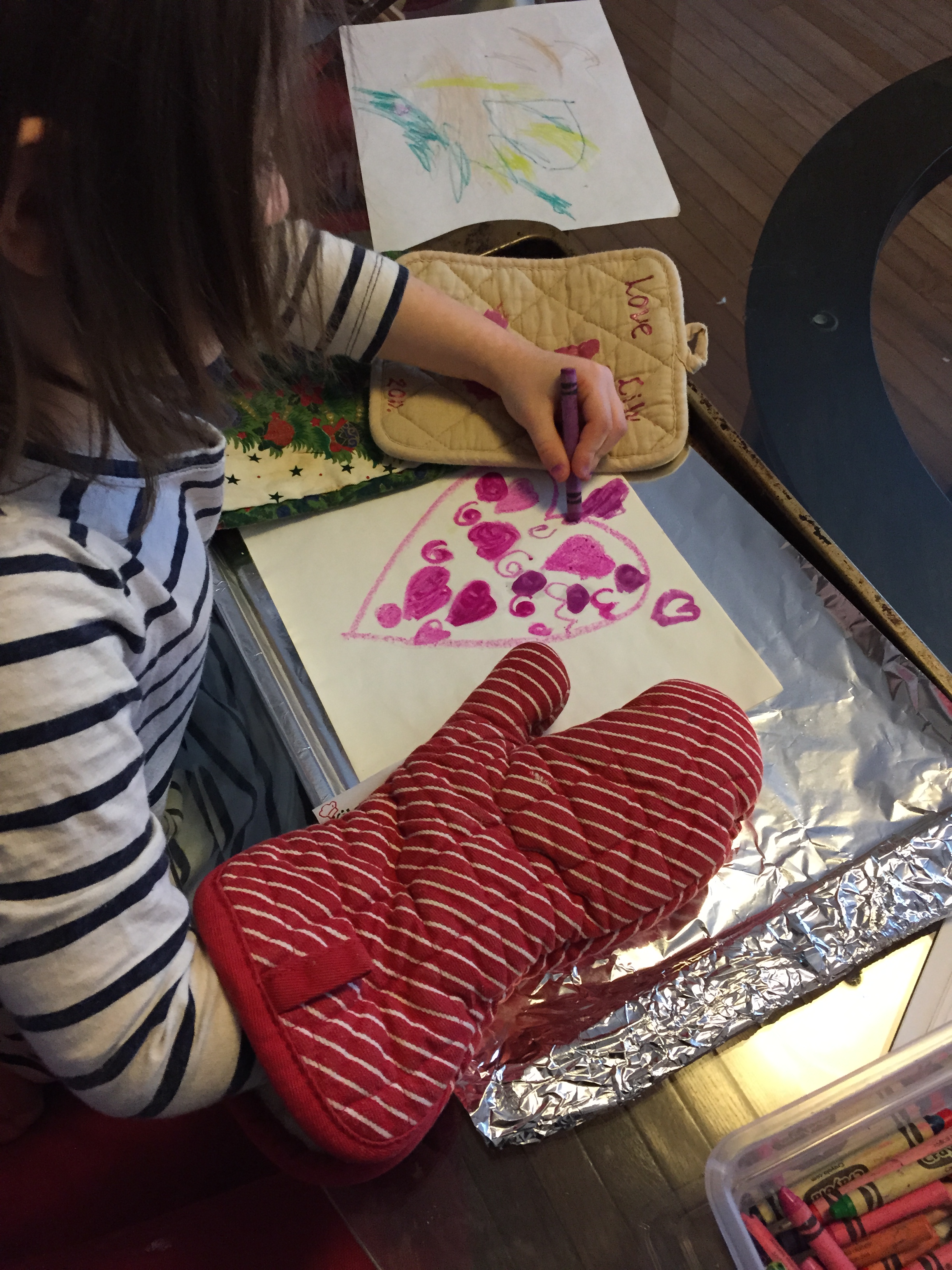 Art: We did some Valentine’s art today. It was Groundhog Day and so O took artistic license and turned his into a celebration of 6 more weeks of winter. Melty crayons and then painted with watercolor. I can’t wait to get them up on display! Idea from Artful Parent