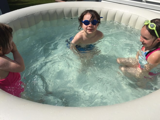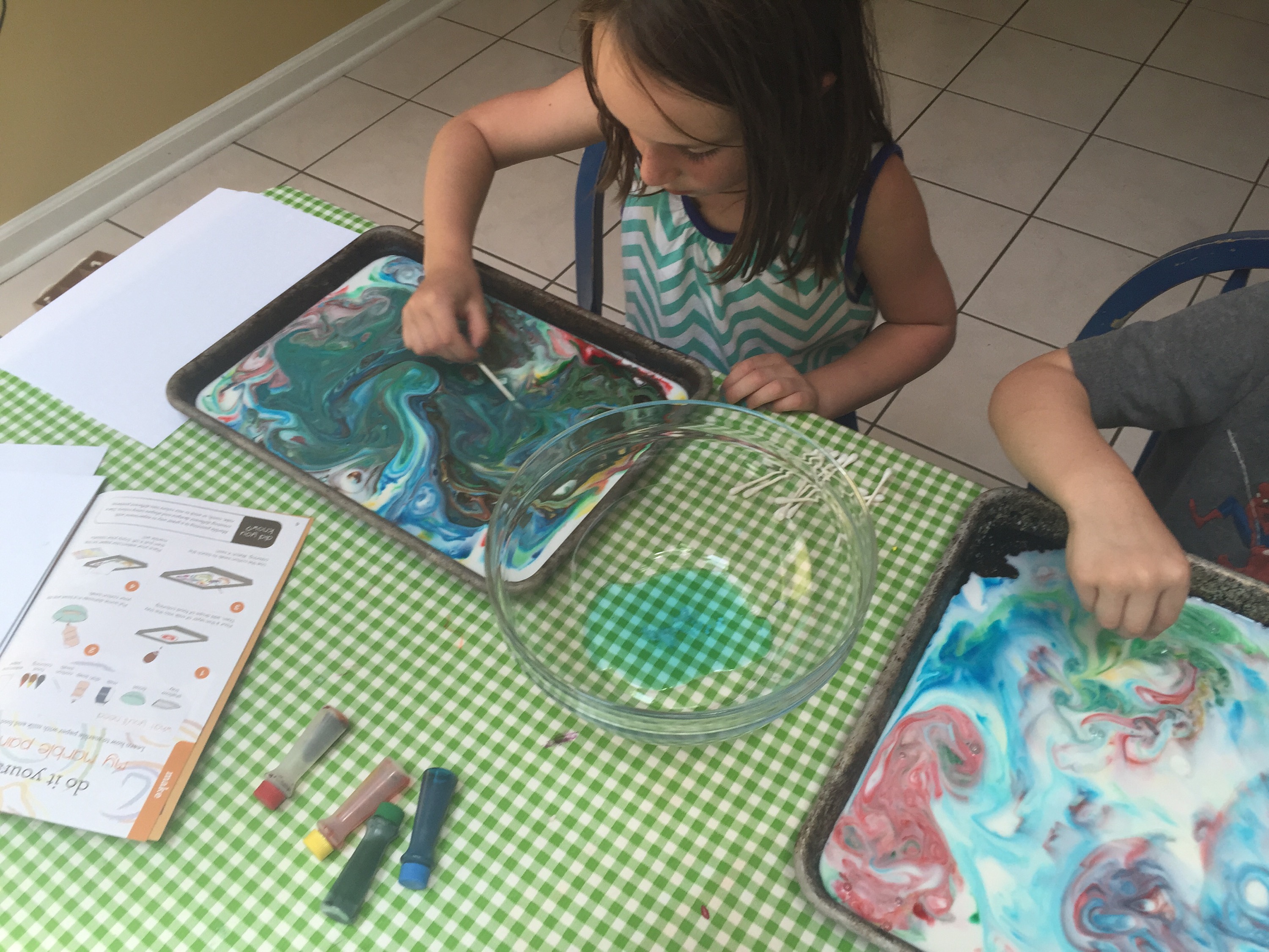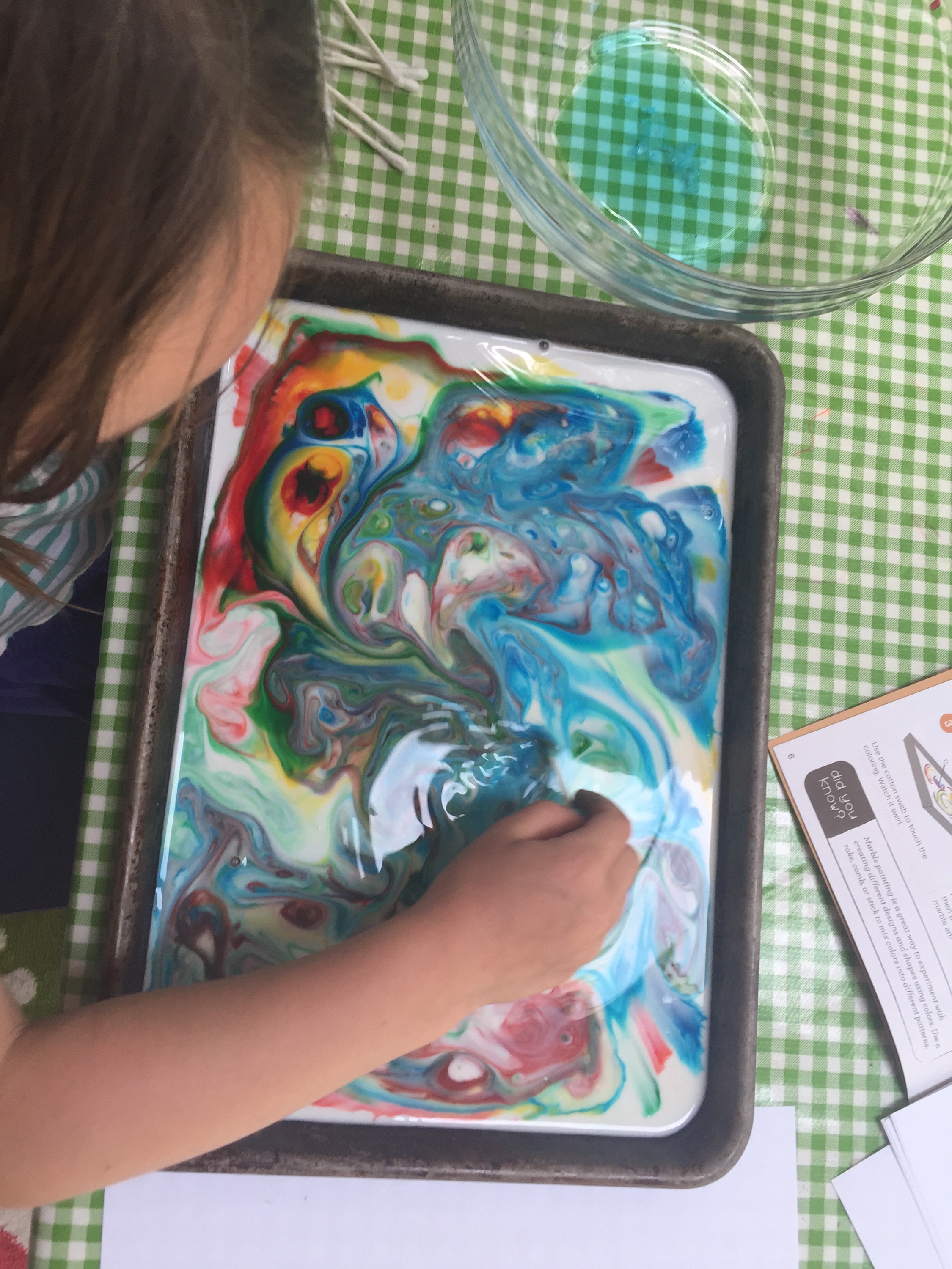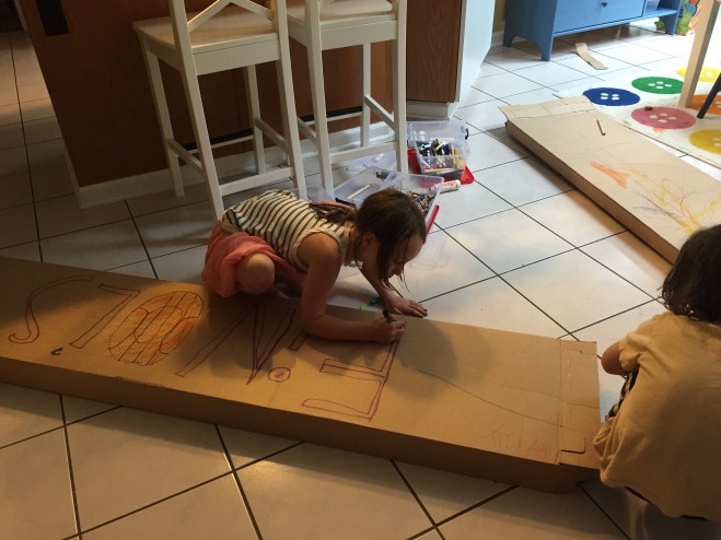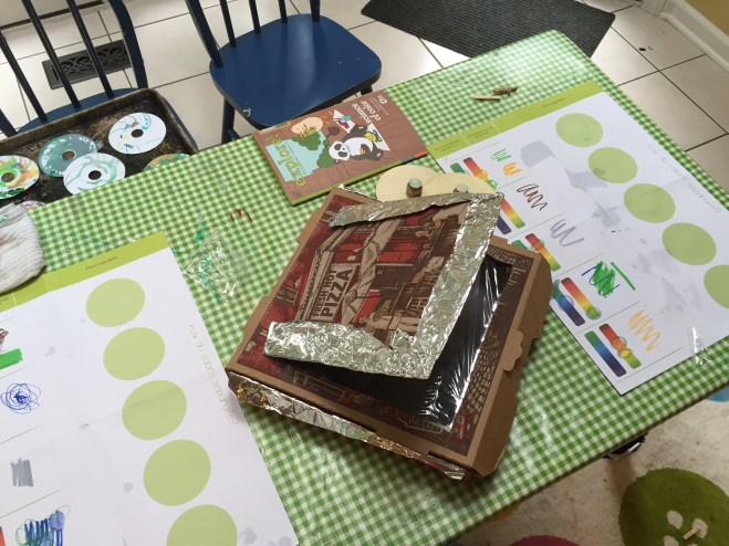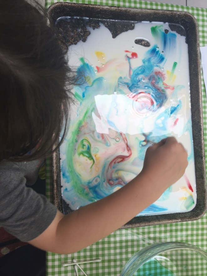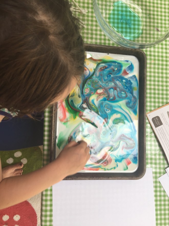 The milk marble paint (first few pictures) was yesterday. Today was a solar oven to make s’mores, color science activities like spin art, creating giant-sized signs, and Em writing on her own self with markers.