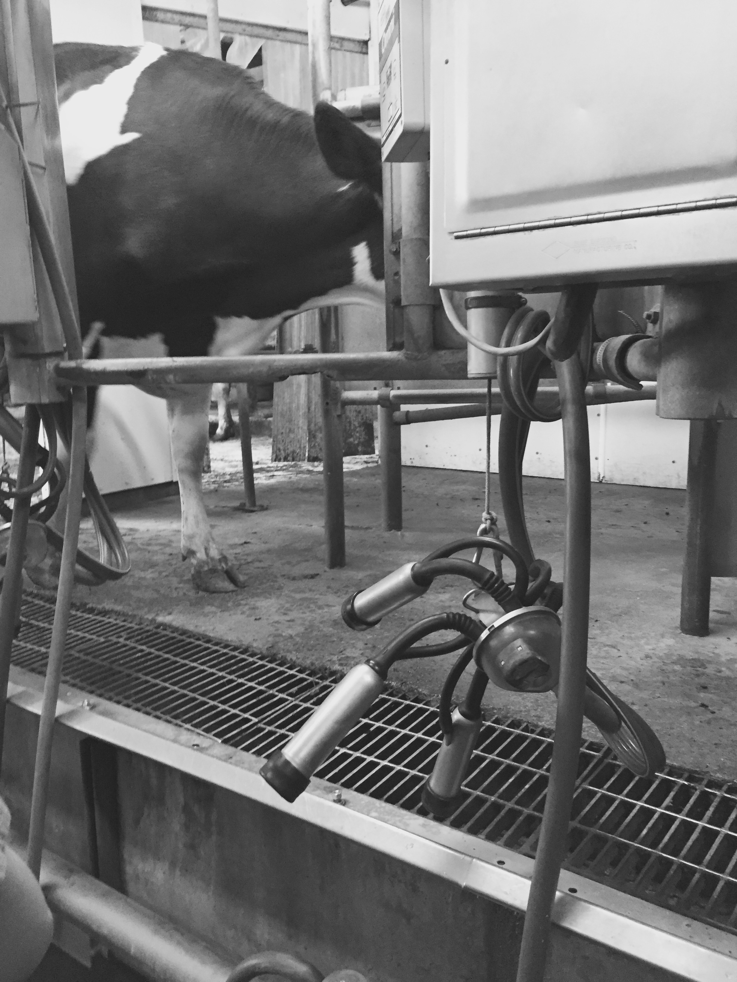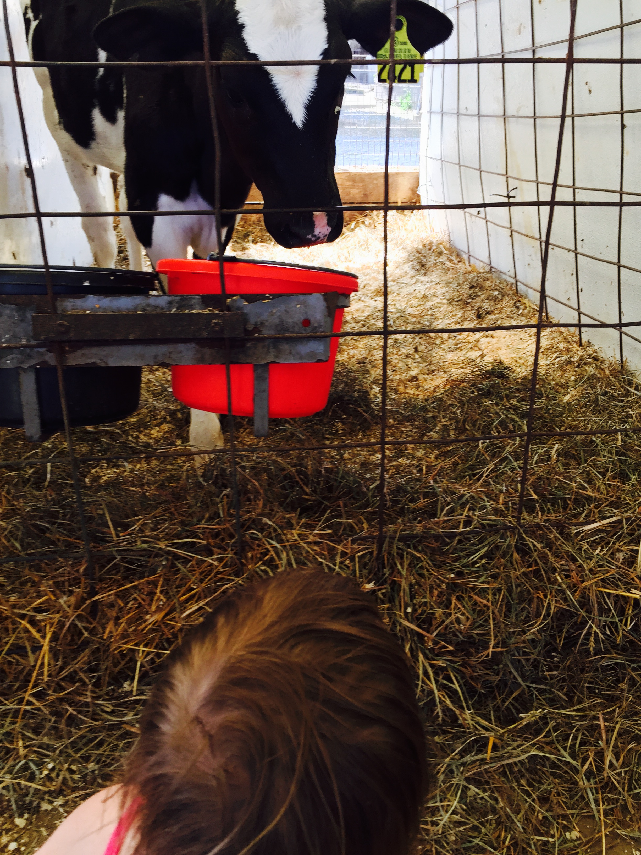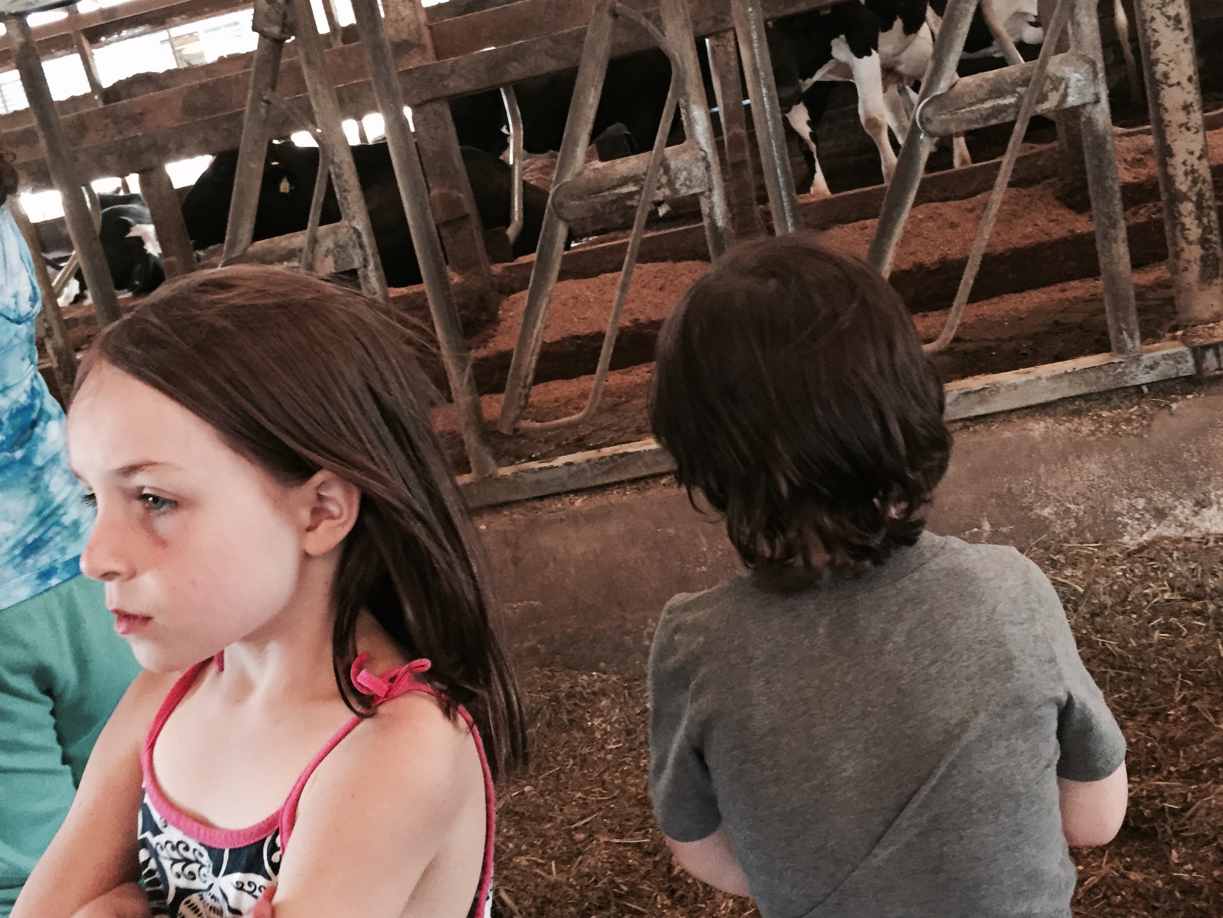 After milking, the tour continued on with the new calves. This part was the cutest and hardest to take. Baby boys are sent away to the “boy cow farm” when they are a week old. We saw both boys and girls. Girls had yellow tags. All the cows are born with horns which are removed upon birth. This is strictly a dairy farm so no other animals there, much to the kids’ dismay.