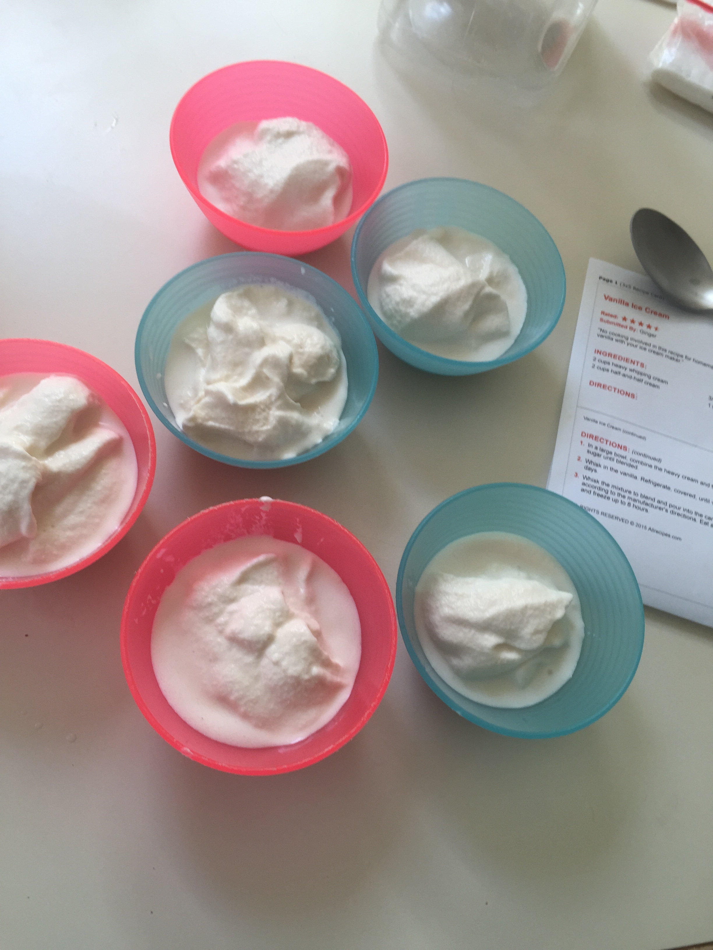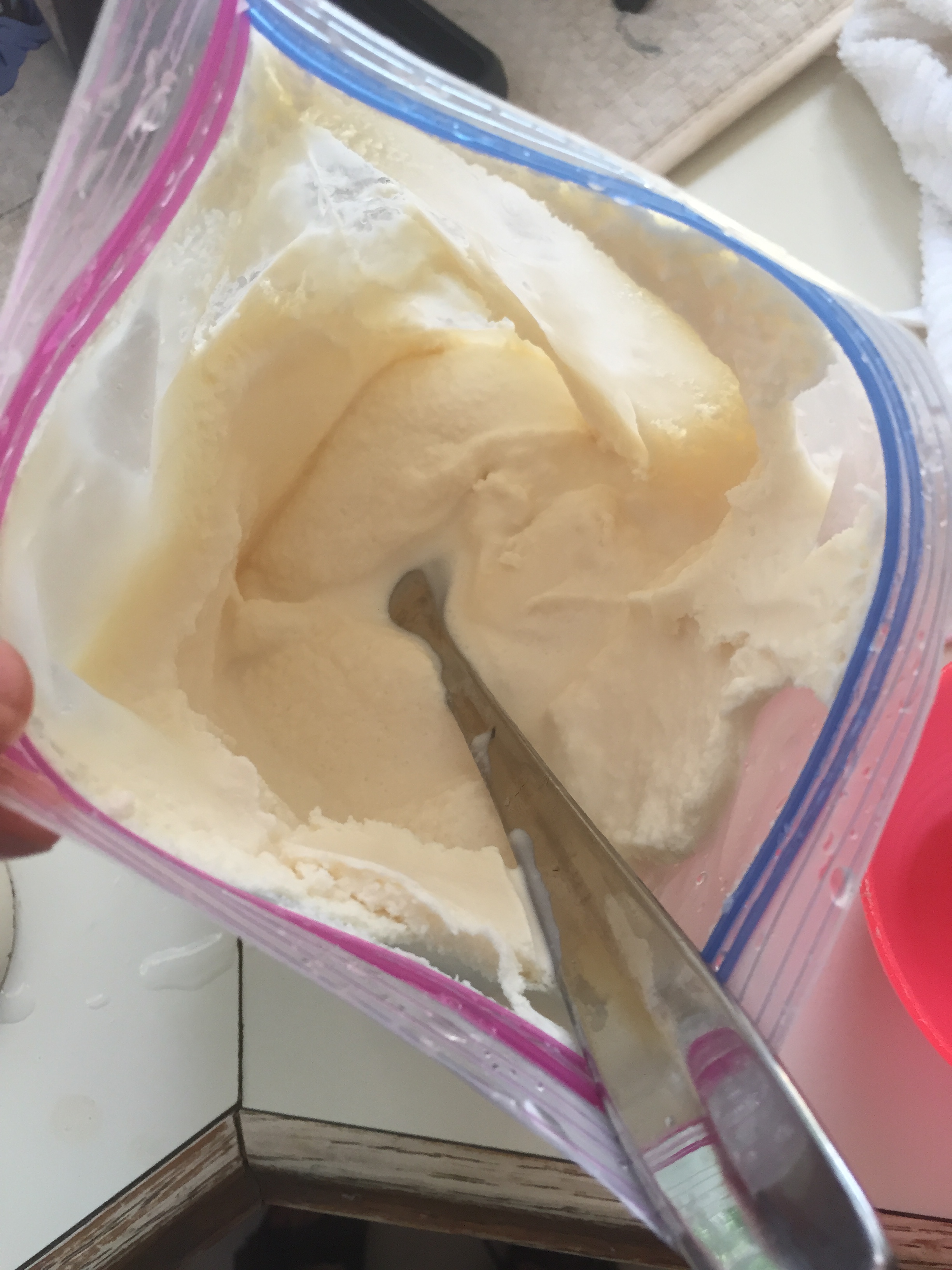 I am no Caroline Ingalls, that’s clear, but we did make ice cream today from three ingredients and used our own muscles and movement to make it. A little taste of pioneer life here in 2015. Ice cream is a great motivator–all who wanted a taste had to eat many veggies with lunch and clean up the perler beads (can you tell this is a newfound obsession as I have mentioned it a few times now) First I combined cream, sugar and vanilla, poured it into one bag and placed inside a larger bag with lots of ice and salt. Next, the kids all took turns shaking it. Luckily we had a lot of visiting playmates and so the shaking wasn’t too strenuous. But the bag was incredibly cold! So cold it numbed your hands if you shook for much time at all. Note to self: use gloves next time. Oh, yes, there will be a next time!