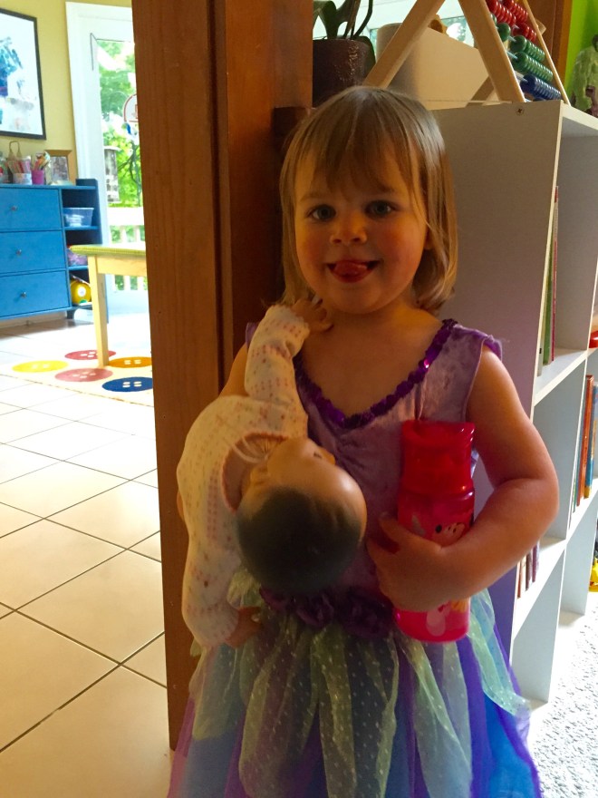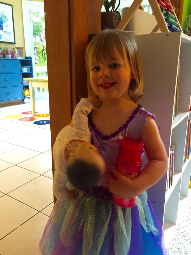 That girl is ready for ANYTHING! Got baby Noonie, Minnie Mouse water bottle, and party dress on. Bring it on! Reply