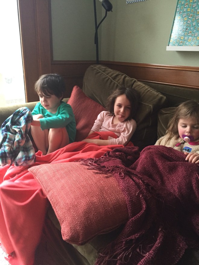 Were down with some sort of fever/cough/stuffy nose. It was the least energetic, collectively, I have see them be for??? Forever? While there was watching, there was also just laying about and LEGO and a few naps. Lily thought it was a good day to be sick since it rained. With the time change, I guess we lucked out. Only Emmy seemed to need a little more coaxing to go to bed. She is well but also took a nap. This was as everyone was needing a little more fever reducer; only twice today were we in this kind of a mood.